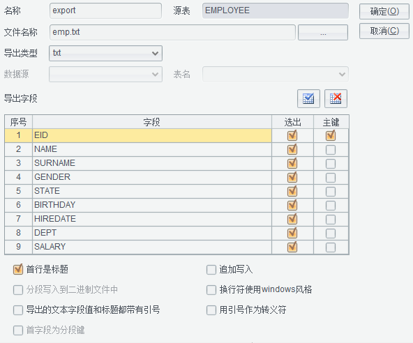 例如将上面的EMPLOYEE数据表另存为成emp.txt文件,在EMPLOYEE数据界面中点击文件 - 复杂保存,界面如下: