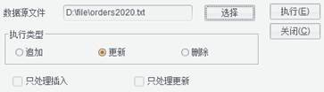 更新:根据数据源文件对比组表的键值,键值能找到的则更新,找不到的则插入;执行类型为更新时还可以选择只处理插入或只处理更新;