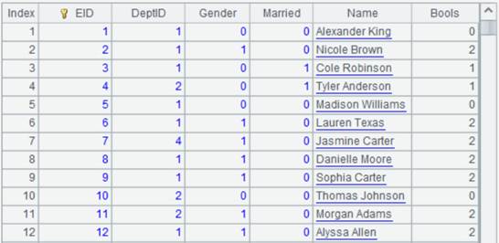 示例的组表文件emps.ctx中有员工ID,部门ID,性别,是否已婚,以及姓名等字段,其中性别与是否已婚再合并用一个字段Bools存储。数据内容如下: