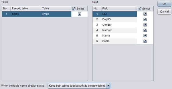点击【Select】,选择解压后的组表文件emps.ctx,系统自动识别文件名emps作为虚表名,并在Select filed(s)列出组表字段和主键信息: