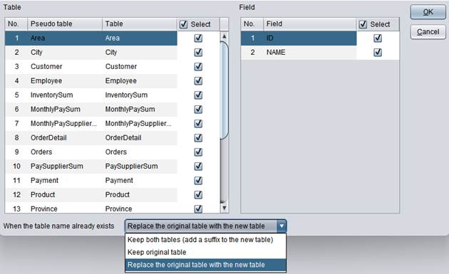 可在“When the table name already exists”下拉框中选择原表和新表的替换情况。
