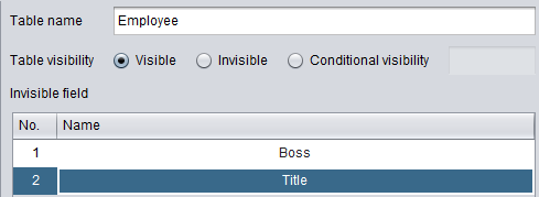 DQL表除了可设置表可见性还可以设置字段可见性,在Invisible field 中可选择不可视字段,比如设置Employee表中的Boss与Title字段不可视: