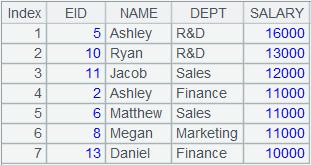 =connect("demo").cursor("select top 20 EID,NAME,DEPT,SALARY from employee").sortx(DEPT) |