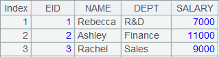 =connect("demo").cursor("select top 10 EID,NAME,DEPT,SALARY from employee") |