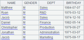 =demo.cursor("select NAME,GENDER,DEPT,BIRTHDAY from EMPLOYEE") |