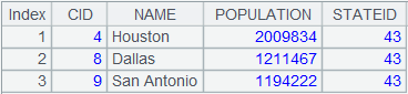 =connect("demo").cursor("SELECT top 10 CID,NAME,POPULATION,STATEID FROM CITIES") |