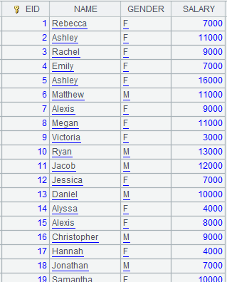 =connect("demo").cursor("select EID,NAME from employee") |