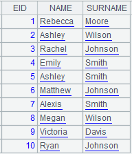 =connect("demo").query("select top 10 EID,NAME,SURNAME from EMPLOYEE") |