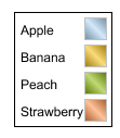 "Legend"表示绘制的图元为图例; "legendText":A1表示图例文字内容为Apple,Banana,Peach,Strawberry; "x":0.81 / "y":0.2 表示在画布x / y轴上的起始坐标位置,数值大于0小于等于1时表示占整个画布宽(/长)的百分比; "width":90表示图例区域的宽度为90像素。 |