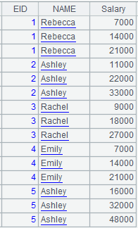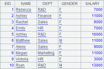 =demo.query("select top 10 EID,NAME,DEPT,GENDER,SALARY from EMPLOYEE") |