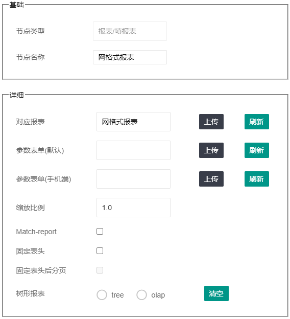 根据需要选择要添加的节点类型,有分类夹、超链接、报表/填报表、统计表、DQL明细查询、DQL分组分析、业务填报七种类型。本例节点类型选择“报表/填报表”,对应报表选择已导入的网格式报表。