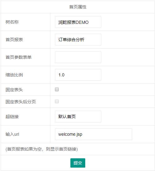 首页报表:选定点击此节点时要展现的报表/填报表,下拉列表会将报表管理中已上传的所有报表(组)/填报表类型的文件列出。