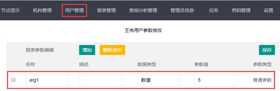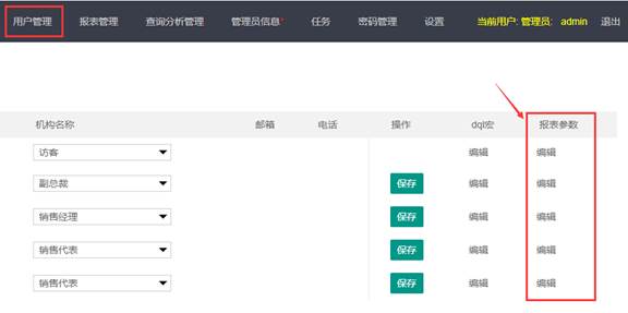 报表有参数时,可在用户管理设置报表参数,参数名需与报表中的参数名保持一致且唯一。同一张报表不同的用户设置不同的参数值可看到不一样数据。