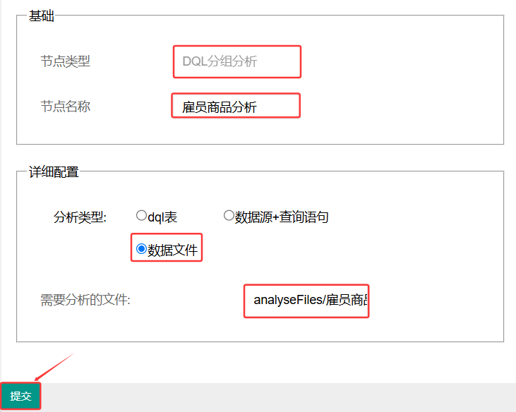 发布分析文件时节点类型选择“DQL分组分析”,按下图红框所示依次填入节点属性,提交后,选择的分析文件就发布到客户分析分类夹下了。