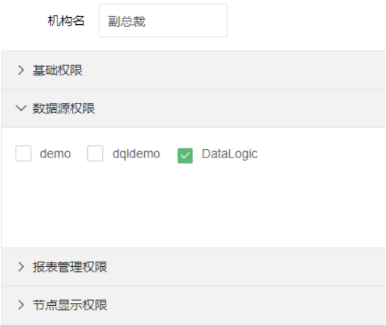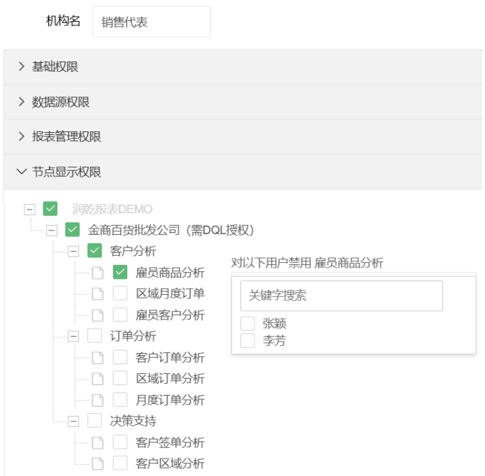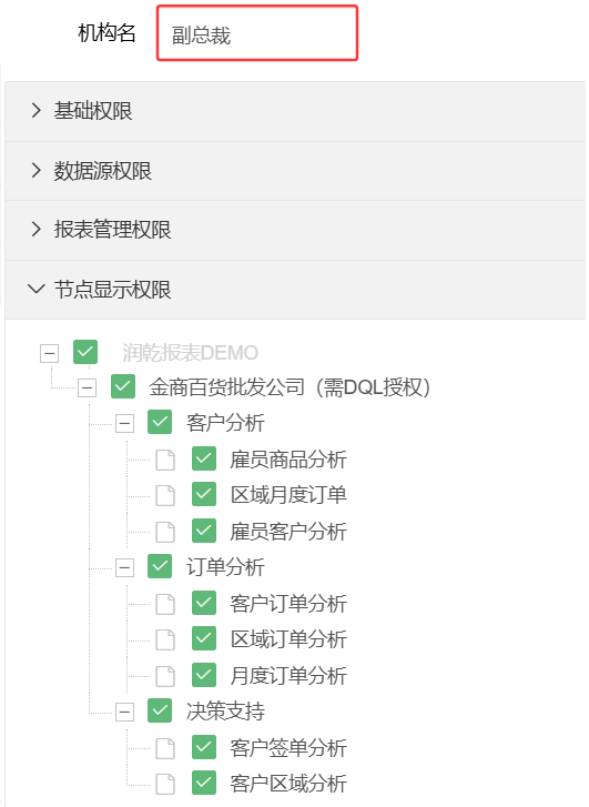 节点显示权限:设置该机构下的用户可以查看的报表显示节点。