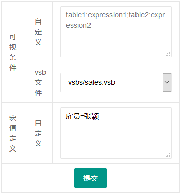添加DQL宏时可视条件有自定义和vsb文件两种方式,在DEMO应用中我们使用的是预先已准备好的可视文件(.vsb),并给vsb文件传递不同的宏值(vsb文件需要先通过查询分析管理上传至报表中心)。