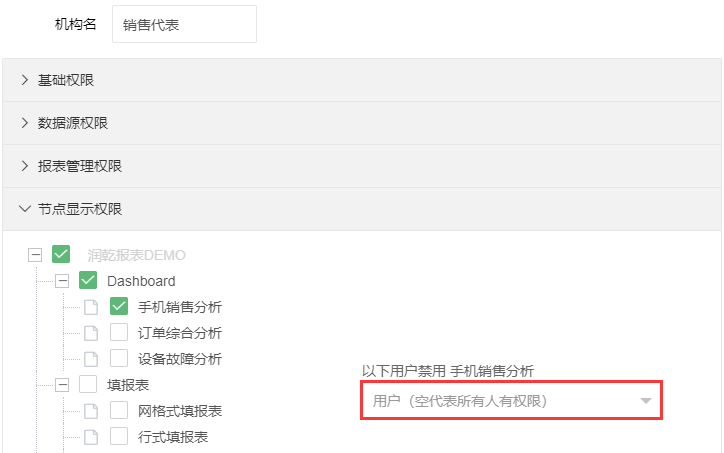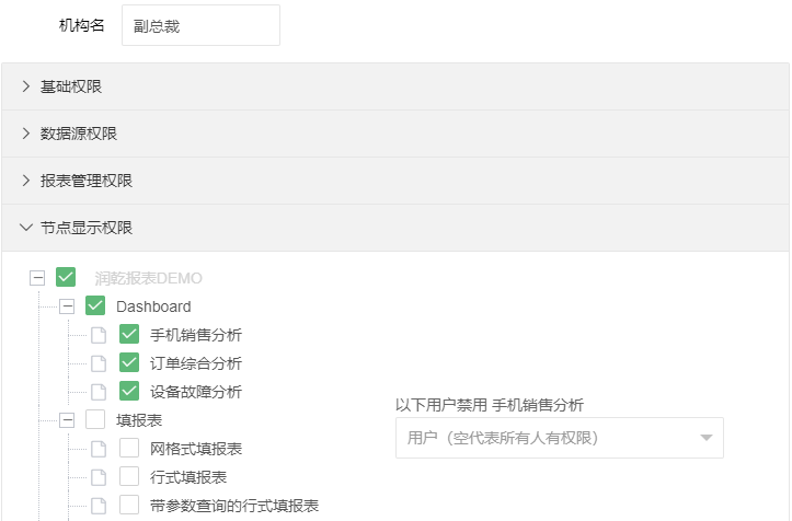节点显示权限:设置该机构下的用户可以查看的报表显示节点。
