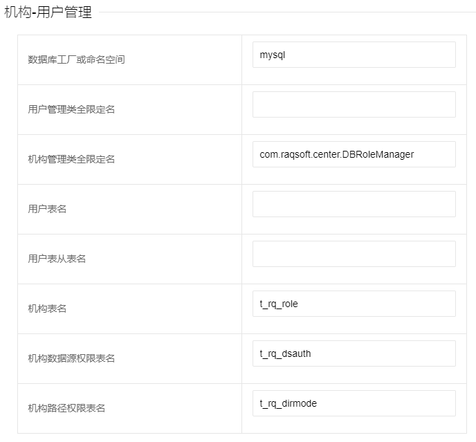 机构管理类全限定名:继承com.raqsoft.center.CachedRole抽象类,并实现com.raqsoft.center.RoleManagerInterface接口的类路径