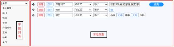 通用查询模块主要分为字段列表和字段查询2个区域: