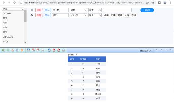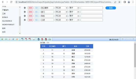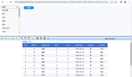 至此动态列报表就完成了,在浏览器地址栏输入:http://localhost:6868/demo/raqsoft/guide/jsp/cqIndex.jsp?table=员工&metadata=WEB-INF/reportFiles/commonQuery/commonQueryMetadata.splx&rpx=commonQuery/commonQuery.rpx: