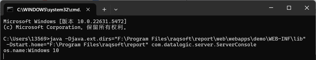 java -Djava.ext.dirs="F: \Program Files\raqsoft\report\web\webapps\demo\WEB-INF\lib" -Dstart.home="F:\Program Files\raqsoft\report" com.datalogic.server.ServerConsole