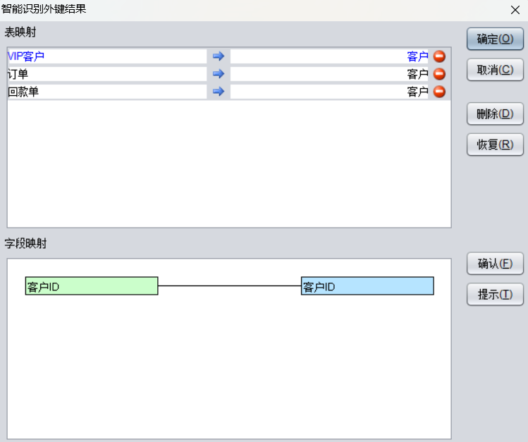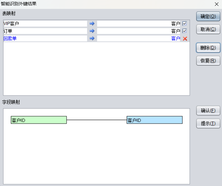 对系统自动识别出来的关系,可以进行人工审查,并进行干预和调整,以便最大限度的保证模型的正确性。点击【确认】可以确认使用一条映射,点击【删除】则不使用,调整后如下: