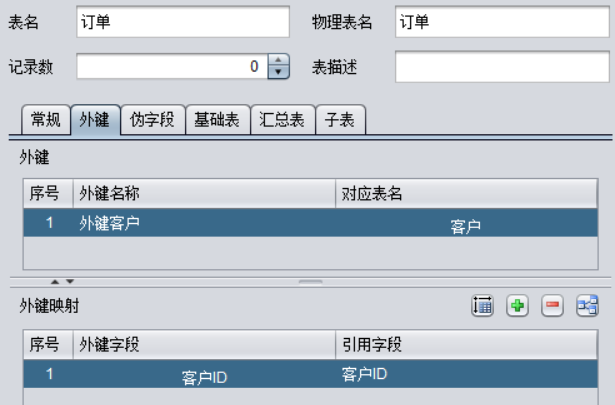 在元数据中,当A表中有多个主键时,对部分主键字段添加外键后,在外键对应的主表中会自动将A表做为子表列出。子表外键必须关联主表主键字段。