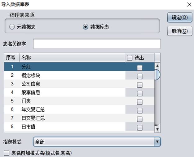 物理表可以在当前数据源的数据库表中选择,也可以在元数据表中选择,选择的物理表必须具有相同的数据结构: