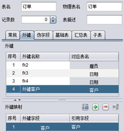 在元数据中,当A表中有多个主键时,对部分主键字段添加外键后,在外键对应的主表中会自动将A表做为子表列出。通过添加子表,可以在主表中可以直接对子表字段进行汇总查询。如客户,根据添加子表回款单,可在查询客户表字段的同时对回款单表中的字段做汇总查询。子表外键必须关联主表主键字段。