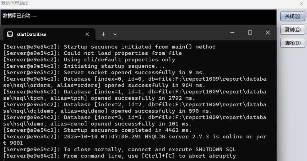 本例以产品自带的dqldemo数据源为例,点击菜单服务 - 启动示例数据库,控制台显示“数据库已启动”信息,表示dqldemo数据源所需连接的HSQL数据库已启动。