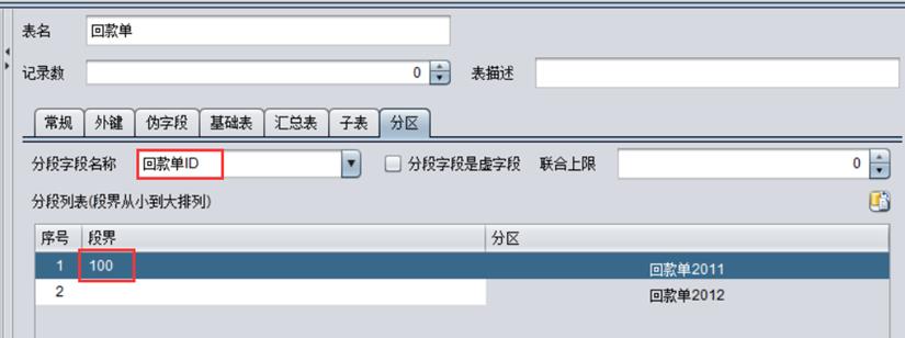 图中的设定,相当于设定分区回款单2011 中,分段字段回款单ID<=100;最后的一个分区回款单2012 的段界可以为空白,此时最后一个分区无上限。