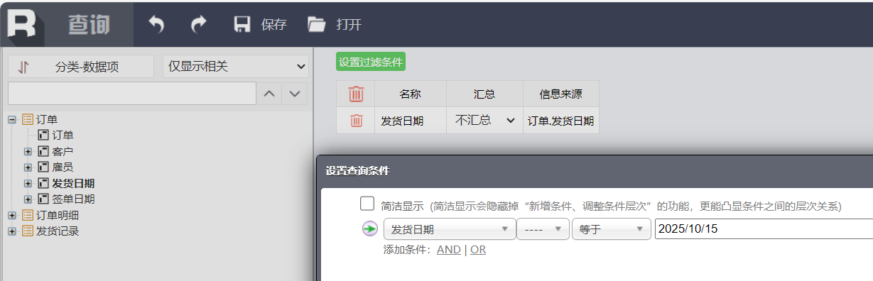 将上述示例代码添加到[安装根目录]\report\web\webapps\demo\raqsoft\guide\jsp\ qyx.jsp中,刷新页面后拖拽"日期"维度,点击"日期"对应的过滤条件,在"设置查询条件"窗口中通过日期控件选择日期2025-10-15后即可看到效果。