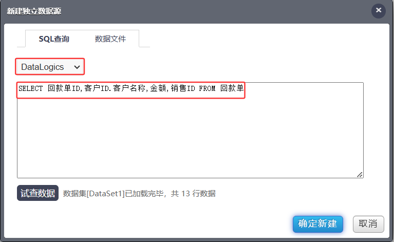 分析控件中新建数据集,点击数据源下拉框,选择“独立数据源”,选择使用多物理库DQL Server服务的数据源Datalogics,编写查询语句,如下图所示: