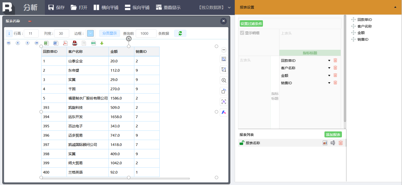 设置查询语句后,点击【试查数据】,即可保存数据集。确定新建即跳转到新的多维报表分析页面,查询结果如下: