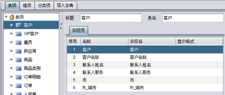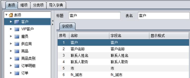 在菜单中执行系统 - 导入元数据,导入元数据文件中的表项和维项,导入后,各个表项和维项的名称默认与其在元数据中定义的名称相同: