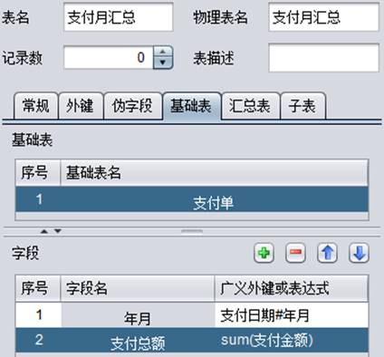 2) 在定义基础表功能时,其中的字段名,必须包括主表的所有关键字段,如上图中的年月为支付月汇总主键,必须定义广义外键或表达式。计算字段可以全写,或只写一个。