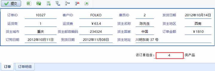 以7.1.sht为例,如果我们想在订单sheet中显示该订单包含多少种产品,那么我们可以选中订单sheet中的G11单元格,编辑表达式为=count({订单明细!C3}),自动计算结果如下图所示: