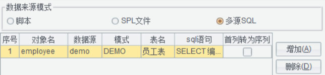 使用填报表时,如果是从数据库取数,还可使用多源SQL,此时一个对象对应一张表,且不支持多表关联。