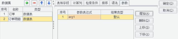 点击填报 - 参数,打开参数编辑界面。添加参数arg1,设置缺省值为10327。订单和订单明细有外键关联。