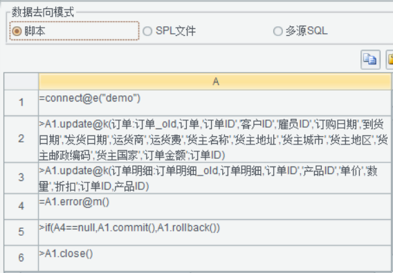 点击填报 - 数据处理,设置数据来源和数据去向。数据来自订单表和订单明细表。