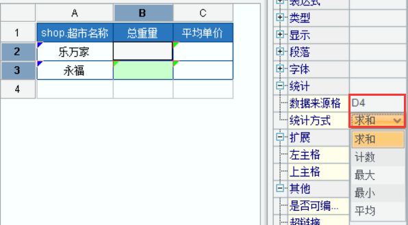 统计分析的规则是针对某个对象的某个字段的所有数据做统计汇总,这个字段来自数值格。如果是可扩展的网格或行式中的单元格,那么这个单元格就是一个可扩展的单元格,例如本例中的D4,表示对行式扩展出来的数量(公斤)列中所有数据进行统计;如果是非扩展的网格,那仍然定位到网格所指代的字段上,将会统计该字段中的所有数据,下文将会举例说明。