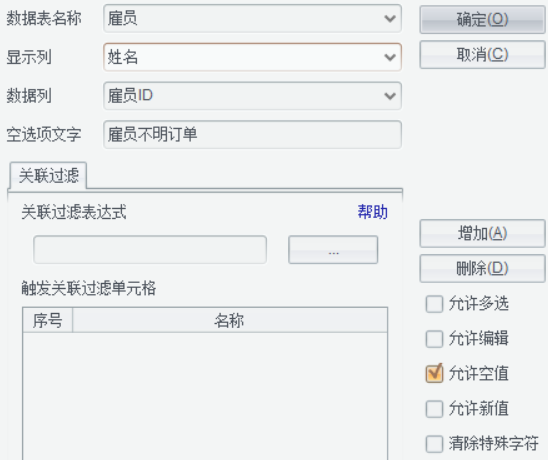 点击【设置】按钮,弹出下拉数据表编辑对话框,设置数据表名称、显示列、数据列和空选项文字。内容如下图所示: