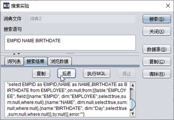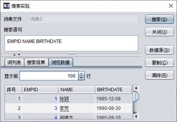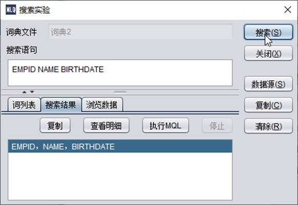 此时,实际上已经可以尝试查询数据了,在菜单栏中选择工具 - 搜索实验,就可以在搜索窗口中执行查询了,如搜索语句“EMPID NAME BIRTHDATE”: