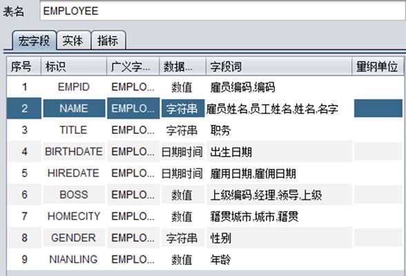 可以看到,元数据中的表被导入为汉语查询数据结构中的表,普通字段以及伪字段被导入成为了表中的宏字段。宏字段的各项属性中,标识为宏字段的名称,广义字段表达式则需要包含宏字段在元数据中对应的表名和字段名,字段词则在汉语查询查询时使用,可以查询到对应宏字段。导入后,标识和字段词会读入元数据中对应的字段名,数据类型也会从元数据中对应读入,广义字段表达式也会按元数据中对应的表名和字段名自动填充。