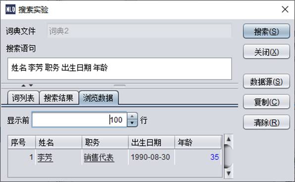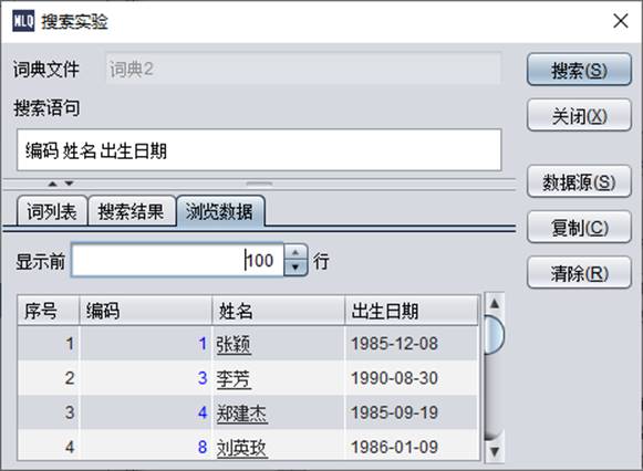 如果需要用多个字段词描述同一个宏字段,各个字段词中间用英文逗号分隔。修改字段词后,就可以用新的字段词执行查询了,如搜索“编码 姓名 出生日期”: