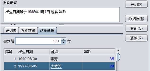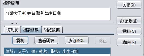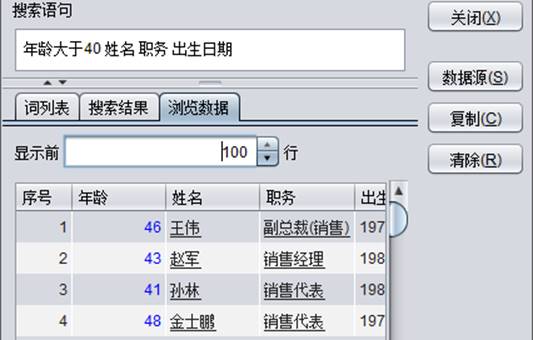 实际数据查询中,除了选出指定值的数据,也经常需要的通过比较条件执行筛选,如尝试执行搜索语句“年龄大于40 姓名 职务 出生日期”,结果如下: