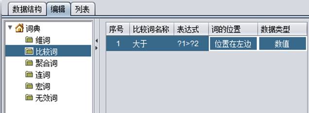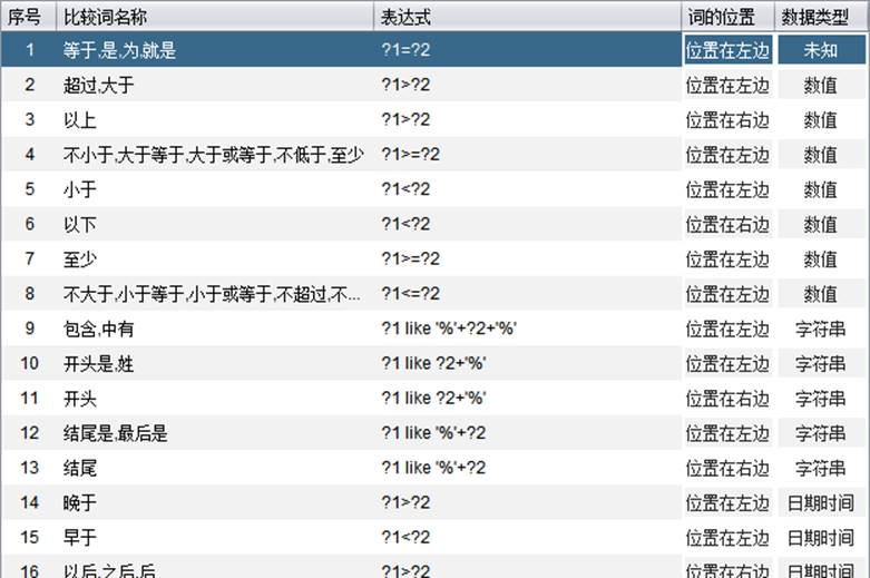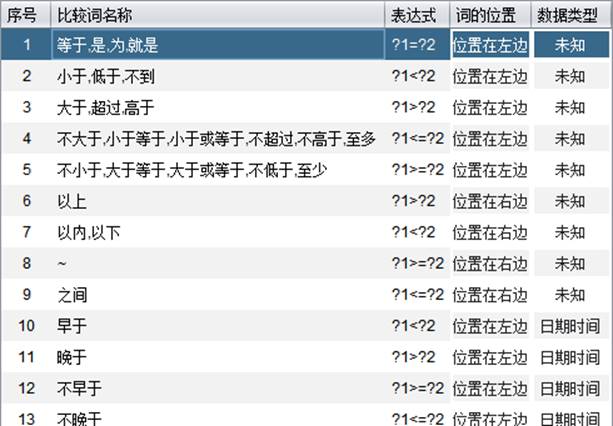 如果比较词可能用于数值型字段的判断,也可能用于其它类型如字符串、日期时间等类型字段的判断,可以把对应的数据类型选为未知,也可以针对不同类型分别设置比较词。比较词的设置可能会随着实际业务的情况以及用户的习惯调整。