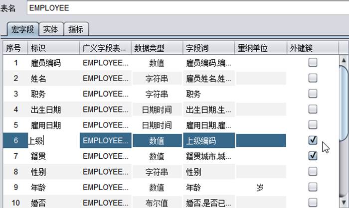 表默认的字段簇,就是它的首个实体关联的字段簇员工,而前面销售员外键表显示的就是员工字段簇的标记字段。