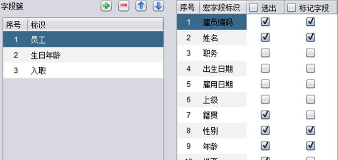 与簇词类似,还可以设置外键簇词,把表中的一些外键设为簇词。为此,首先需要在宏字段设置中将这些字段标记为“外键簇”,如这里的客户编码和销售编码: