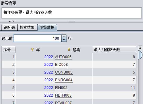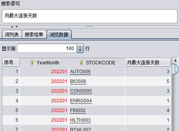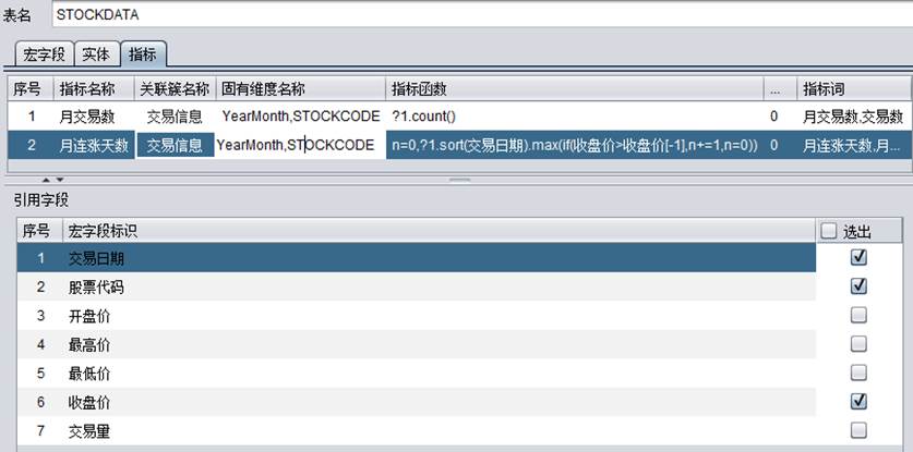 数据库中的数据在获取时,顺序有可能会混乱,因此这里计算连涨天数时,首先用sort函数将数据排序。这个指标的固有维度,除了月YearMonth之外,还需要有股票代码STOCKCODE,双击固有维度名称可以设定多个固有维度。